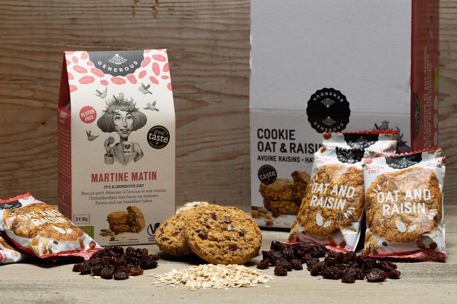 ■オートミールの原料でもあるオーツ麦を使用したクッキー。■レーズンを加え、動物性原料を使わずに焼き上げています。■ヘルシーで栄養価も高いので、ギルトフリーなおやつに。また、ブレックファーストベイクとして忙しい朝の栄養補給としてもご提案いただけます。■イラストが目を引く化粧箱を活かして、置くだけでオシャレな売場づくりが可能です!